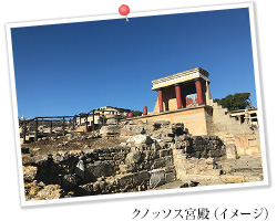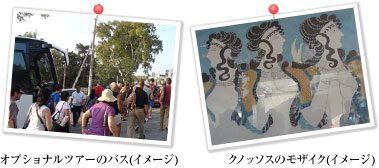 オプショナルツアー:クノッソス宮殿観光。約3時間のバスツアーでアクティブに。バスでクノッソス宮殿へ。ガイドさんの後に進みながら、牛の壁画、玉座の間、女王の間、劇場などを見学します。