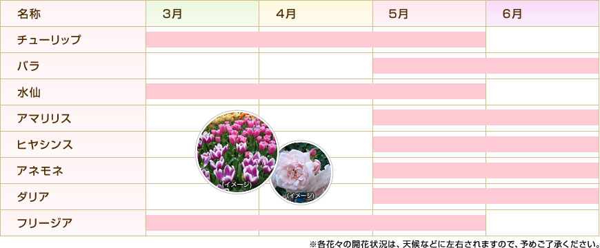 開園期間中いつ行ってもお花が楽しめるように庭師さん達が手入れをしており、また、大きなパビリオン(温室)もありますので、お天気にも左右されずいつでも美しいお花をご覧いただけます。