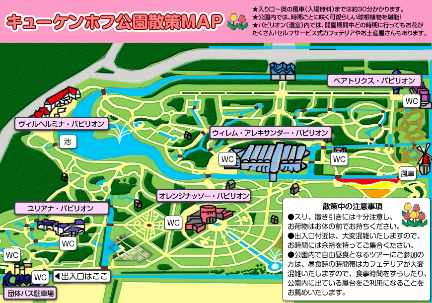 ツアーによっては、園内にて各自ご昼食をお取りいただくものもありますが、各パビリオン内にはセルフサービス式のカフェテリアがあり、言葉の心配なく注文できます。また、園内の色々なところに出店もあり、お花を眺めながら食べ歩きもお楽しみいただけます。