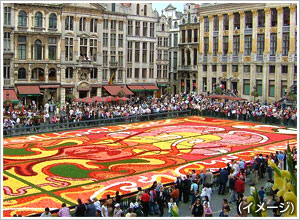 2年に一度行われるブリュッセルの一大イベント、フラワーカーペット。世界遺産の「グランプラス」全体に、色とりどりのベゴニアの花が並べられます。約75万本もの花を使用したフラワーカーペットは圧巻で、訪れる人々を魅了します。