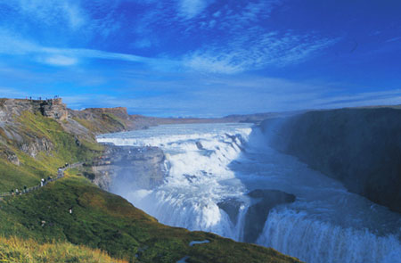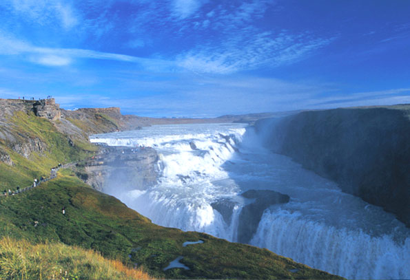 何と言っても外せない観光地グトルフォス。アイスランド語で“グトル”は「金」、“フォス”は「滝」を意味し、「黄金の滝」という意味を持っています。最大幅は約70メートル、最大落差は1段目で約15メートル、約30メートルあり、大迫力の見応えある滝です。