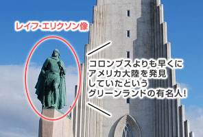 また、このハトルグリムス教会の前に目を引く緑色の像があります。西暦1000年にアメリカ大陸を発見したレイフ・エリクソンという人物です。(なんとコロンブスよりもおよそ500年も早くにアメリカ大陸を発見したという説も!)レイフはアイスランドで生まれ、グリーンランドで育ったといわれる、この土地の有名人です。