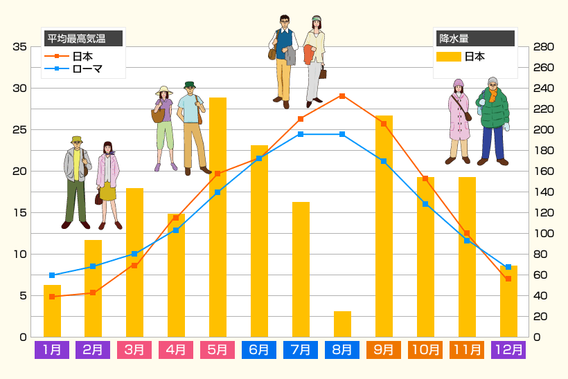気温に関しては、イタリアの首都ローマと東京は1年を通してほぼ同じくらいです。一方で降水量は大きく異なります。地中海気候といわれるイタリアでは、夏に雨がほとんど降りません。そのため、夏は湿度が低くカラッとしていて過ごしやすいです。しかし日本の夏よりも日差しが強く感じるでしょう。