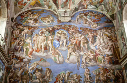バチカン美術館内のシスティーナ礼拝堂に描かれたミケランジェロの代表作。イエス・キリストが、死者に裁きを行い、天国へ行く者と地獄に墜ちる者とに分ける場面。個人の描いた絵画作品としては史上最大で、実際にご覧いただくとその迫力に圧倒されます。