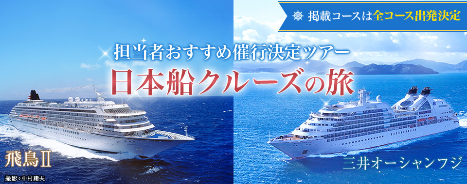 日本船クルーズ旅行・ツアーなら、クラブツーリズム!言葉やチップの心配はもちろん不要。和食、大浴場をはじめ、”おもてなし”の奥ゆかしさは日本船ならではです。心地よい日本船で日本の四季を満喫してみませんか。ツアー検索・ご予約も簡単です。
