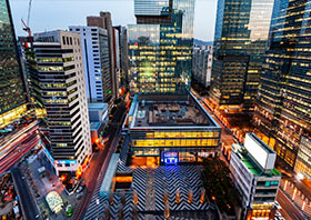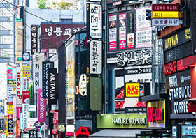 ソウルの中心を東西に流れる川、漢江(ハンガン)を境にした南側のエリア。高層ビルが建ちぶビジネス街やハイブランドショップが多く、日本の表参道のようなオシャレな雰囲気が魅力。