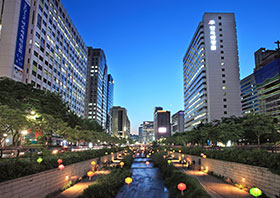 1960年~70年代に時代の流れとともに埋められていた川を復元。川沿いには散策に適した遊歩道があり、夜はライトアップされるなど、観光名所になっている。