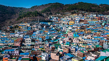 釜山のマチュピチュと称される「甘川洞文化村」。歩いているとあちこちに壁画やオブジェなどアーティスティックな作品があり、高いところから見渡す町並みはとてもカラフル。角度によっては海も見え、とても釜山らしい風景を満喫できる。