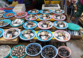地下鉄南浦洞駅からチャガルチ駅にかけて海沿い一帯は、魚を並べた露店でにぎわう。少し先には、1,400もの店がひしめきあう国際市場もあり、買い物が楽しめる。