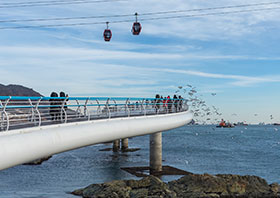 松島海水浴場にある釜山最大規模のスカイウォーク。スカイウォークから眺める松島の海は、とても美しく、遠くに浮かぶ大型船舶や、空を行き交う色とりどりのケーブルカーが絶景を演出。直線と曲線コースを持つ長い散策路は、本当に海の上を歩いているような気分になれる。