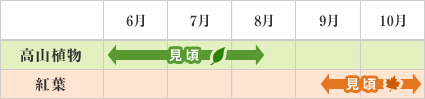 高山植物は5月下旬~8月上旬、黄葉・紅葉は9月下旬~10月下旬がそれぞれ見頃です。