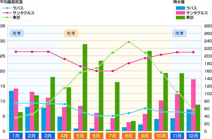 ボリビアは日本とは違い明瞭な四季の変化はありませんが、その代わりに乾季と雨季がはっきりと分かれています。いずれのエリアでも5月~11月頃の乾季にはほとんど雨が降らず、降雨は12~4月頃の雨季に集中しますが、その期間も雨が一日中降り続き観光に支障が出るようなことはありません。