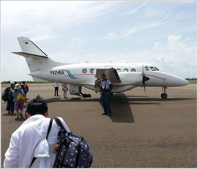 いよいよ、待ちに待ったツアーの始まりです!成田空港には期待に満ちたお客様がいらっしゃいます。アメリカで飛行機を乗り継ぎベネズエラのカラカスへ。ここからは、セスナ機に乗ってギアナ高地観光の拠点カナイマへ。カナイマへ降り立つとそこには雄大な自然が広がり、恐竜の世界に彷徨いこんだかのような感覚を覚えます。観光後、ロッジでゆっくり御寛ぎいただき翌日のエンジェルフォール観光に備えます。