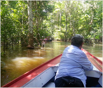 ネグロ川とソリモンエス川の2河川合流地点までクルーズ船で移動します。船内からは運が良ければピンクイルカ(アマゾンカワイルカ)が見られることもあります。ランチの後は、アマゾン川の代表魚・ピラニア釣り体験に!