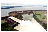パラグアイとブラジルが共同建設で1975年に着工し、91年に竣工した世界最大級のダム。イグアスの滝となって流れ落ちるイグアス川が合流するパラナ川の水を集めている。高さ196m、最大落差95m、全長約8km。