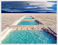 また、ところどころ透明度の高い水がたまり、青と塩田の美しいコントラストをご覧いただけます。ウユニ塩湖よりもアクセスがしやすく、雨季には天空の鏡にくわえ、美しい水たまりをご覧いただいたり、トリック写真をお楽しみただいたりと一度で2度、3度楽しめる観光地です。
