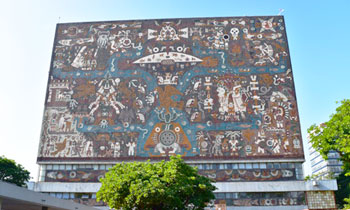 最終日の観光です!まずは世界で2番目に古い大学である【世界遺産(7)】『メキシコ国立自治大学』へ!大学にある壁画は、『民族再発見の爆発』を芸術で表現していて、メキシコ人の力強い意思が伝わってきます。個性的なキャンパスです。