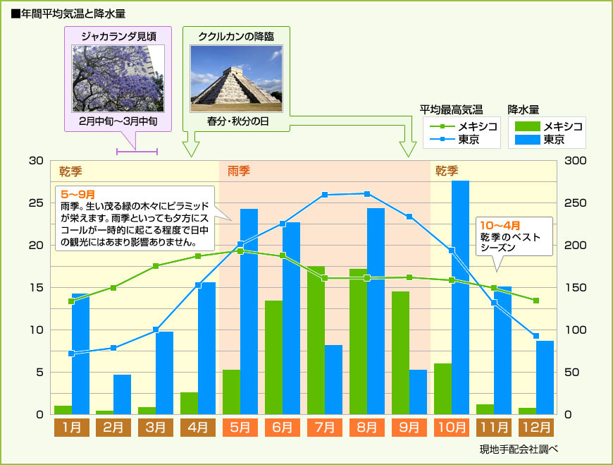 メキシコは、四季の変化がなく、主に季節は雨季と乾季に分けられ、雨のほとんど降らない乾季が観光のベストシーズンといわれます。