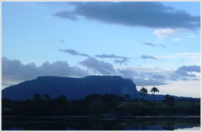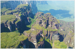 ギアナ高地のテプイでありながら、テプイと呼ばれない特別な山が2つあります。一つはクケナン山、もう一つがギアナ高地の最高峰・標高約2,800mのロライマ山です。イギリスの小説家コナン=ドイルが小説『ロスト・ワールド』の舞台にしたことで世界的に有名となりましたが、下界から隔離された自然環境によって、原始時代から残っていると言われる種類のカエルや食虫植物などの固有種が数多く確認されており、今なお独自の生態系が保たれている神秘的な場所です。特異な気象条件から頭頂部は常に雲に覆われており、通常観光をするには何日もかけてキャンプを張り、山を登っていく必要がありますが、クラブツーリズムでは一部のツアーにおいてご希望の方のみ、別料金のオプショナルツアーをご用意しております。こちらではヘリコプターによる遊覧飛行によって、手軽に頭頂部へ降り立つ観光へご案内いたします。