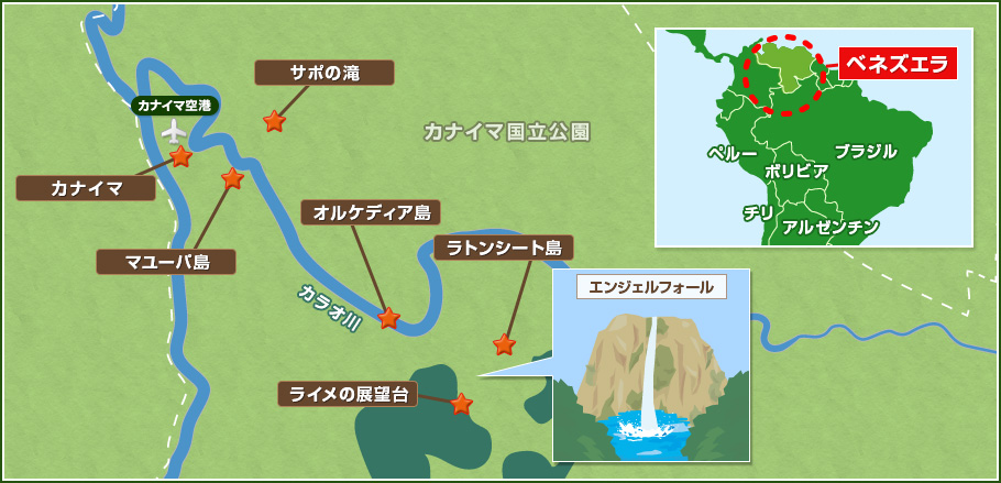 【カナイマ国立公園】の北西部に位置するエンジェルフォールは、観光の拠点【カナイマの村】から小型ボートで川を遡り、ジャングルを抜けて滝へ近づく方法と、同じくカナイマの村からセスナ機に乗って、上空から眺める方法があります。下の地図では、カナイマの村から川を上りエンジェルフォールに至るまでの道筋を紹介します。