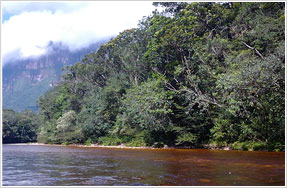 カナイマの村をボートで出発して約30分、最初に立ち寄るのは一面草原が広がる【マユーパ島】です。ここからも周囲にそびえるいくつものテプイとその麓に広がるジャングルという、ギアナ高地特有の景色を楽しむことが出来ます。島に上陸して約30分歩き、対岸にて再び小型ボートへ乗ります。