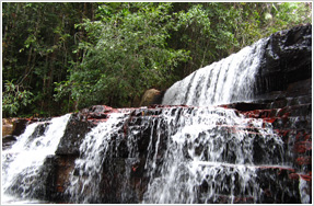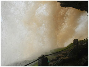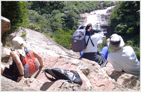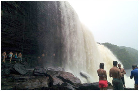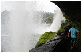 カナイマ村のすぐそばに、【サポの滝】という、滝の落ちる裏側からその姿を見ることの出来る珍しい滝があります。サポとはカエルの意味で、流れ落ちる水の音がカエルの鳴き声に似ていることから名付けられました。乾季にはほとんど水が干上がってしまうため、雨季にしか見学することが出来ない場所です。