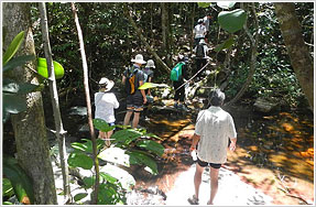 オルケディア島を発って約2時間、エンジェルフォールへのハイキングが始まるポイント【ラトンシート島】の岸辺に到着です。ここから約1時間半かけてジャングルを歩き、エンジェルフォールを間近に臨むことが出来る展望台を目指します。