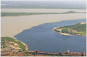 オリノコ川クルーズの見所ポイントはずばり2つです。まず1つ目は、オリノコ川とカロニ川の合流点です。オリノコ川は茶色、カロニ川は黒色をしていてこの2つの川は含まれる成分や水温の違いから交わる事がありません。ボートで合流点の上まで行くと差は歴然です。写真のように上空から見るとくっきり分かれていることが分かるでしょうか?実際に、合流地点付近では、手を川に入れてみると水温の違いを感じられるでしょう。