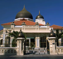 1801年に建てられたインド系イスラムモスクで、1910年に現在のムーア様式に改装されました。「カピタン・クリン」とは創建者であるイスラム商人カウダー・モフディーンの尊称です。クリーム色の外観とドーム状のミナレットが特徴です。