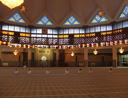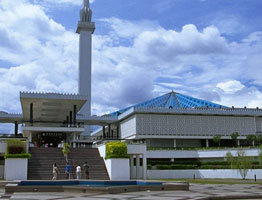 1965年に建てられた、高さ73メートルのミナレット(光塔)がそびえる幾何学模様が美しい近代モスク。中には約8,000人を収容できる礼拝堂がありますが、イスラム教徒以外は礼拝堂には入れません。(写真撮影は可)そのほかにも特徴的な青い屋根をはじめ、壁の隅々までイスラム美術を取り入れておりとても美しいです。特に礼拝堂の屋根は、マレーシアの13の行政区分と、イスラム教における5行を象徴する意味で18の襞になっているとも言われています。
