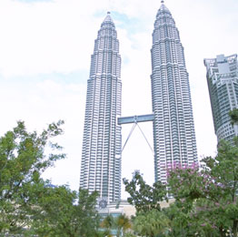 マレーシアの国営石油会社、ペトロナスがイスラム様式のモスクをイメージしてたてた88階建て・高さ452メートルのツインタワーです。クアラルンプールの近代化の象徴とも言え、日中はオフィスビルとして利用されています。41階の連絡通路にある展望スペース「スカイブリッジ」と86階の展望台は定員制で、1日最大1,000人のみあがることができ、市内を一望できます。特に夜景は美しく、一見の価値ありです。下層階にはショッピングセンターのスリアKLCCがあり、お買い物にも大変便利です。