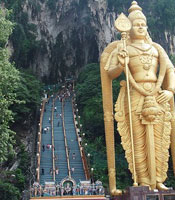 クアラルンプールの郊外にあるバトゥ洞窟は、1982年に石灰岩の洞窟の中にたてられ、ヒンドゥー教の聖地とされている場所です。高さ約30メートルの洞窟へと続く、272段の階段を上った先に大鍾乳洞があり、その先に洞窟寺院があります。入口に聳え立つ高さ42メートルもの神像は圧巻です。階段には多くの野生の猿がいて、攻撃をしてくることはありませんが食べ物などを獲ろうと近づいてくるので注意!