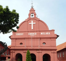 1753年に建てられたオランダ様式の教会。赤いレンガ色がマラッカの象徴的な存在。中にはオランダ統治時代は白い建物でしたが、英国時代に現在のサーモンピンク色に塗り替えられていたといわれています。中にはタイル画の「最後の晩餐」があります。教会周辺の建物群や花々咲き誇る風景はポストカードのように美しいです。