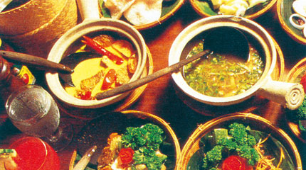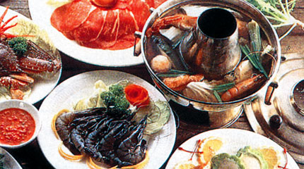野菜やお肉、魚介類を入れて煮込むマレーシア風水炊き鍋。あっさり味のスープが多く、チリソースやおしょうゆなどをお好みでつけて食べます。暑いマレーシアでも人気のメニューのひとつです。