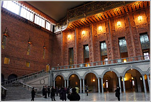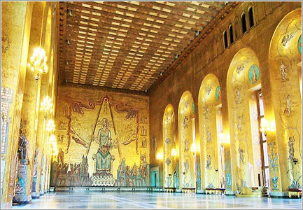 赤茶のレンガ造りの美しい建物。ノーベル賞の晩餐会が行われる場所としても有名な大広間。2階に上がると市議会場、金箔で飾られたノーベル賞受賞パーティーの舞踏会用の黄金の間があります。ノーベル賞を受賞した賢人たちが味わった雰囲気をぜひ肌で感じてください。