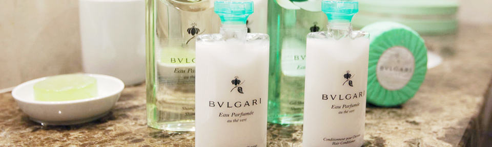 客室の無料アメニティはブルガリをご用意。ルームサービスは24時間無料です。