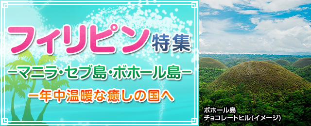 フィリピン旅行・ツアー・観光なら、クラブツーリズムにおまかせ!添乗員付きのツアーだから安心で快適です。首都マニラのあるルソン島やセブ島、ボホール島などの観光地、おすすめのツアーをご紹介。ツアーの検索・ご予約も簡単。