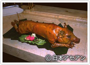 豚の丸焼きは、誕生日やお祝い事の時に振舞われる料理で、皮は北京ダックのようにパリパリで、お肉はジューシーでとても美味しい。