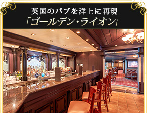 英国のパブを洋上に再現しました。昼はエール(黒ビール)によく合うフィッシュ&チップスをご用意。夜は生バンドの演奏で盛り上がります。