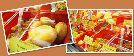 スーパーでもロシアの食事は体験できます。菓子パンやお菓子もありますが、スーパーに行ったらぜひお総菜コーナーへ。量り売りなので指さしで店員さんに言って買てみましょう!サラダや、炒めものなど庶民の味が味わえます。もちろんピロシキはどこにでも♪