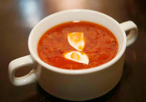 ボルシチは日本でもよく知られているロシアの食事を代表する1つです。日本の味噌汁と同じように各家庭にそれぞれの味があります。写真のように、サワークリームを加えて召し上がっていただくのがおすすめです。ぜひ現地で味わってください。赤い色はスパイスではなく、赤カブ(ビーツ)から出た色です。