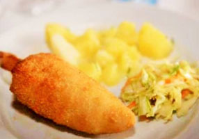 キエフ風カツレツはバターを鶏肉で包んで揚げたカツレツのことで、切った瞬間にバターがあふれだすので食べる時にはご注意を。ウクライナ料理に起源があり、ウクライナの首都キーウからその名を取ったと言われていますが、正確な発祥地はまだ分かっていないそうです。カリッと揚げられた衣とジューシーなお肉が美味。