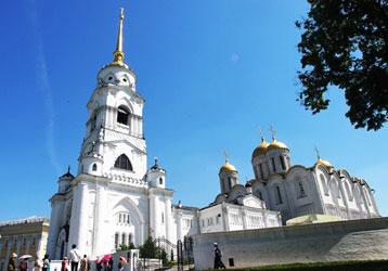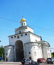 1158年建立当初から、ロシアのメイン教会となすべく計画され、15世紀までは、ウラジーミルばかりでなくモスクワ大公などの戴冠式まで総てここで執り行われていました。小高い丘に建つ姿は非常に美しく、後に建立されたモスクワのウスペンスキー寺院はこれを真似て建てられたものです。「黄金の門」は、ウラジーミルの正門です。キエフにある黄金の門を基にして建てられました。門の上にはリゾパラジェーニエ礼拝堂があります。