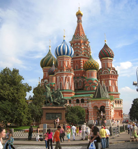 赤の広場の「赤」とは色のことではなく、ロシアの古い言葉で「美しい」という意味です。クレムリン城壁の東側、国立歴史博物館やワシリー寺院に囲まれた、7万3000平方メートルの広場。旧ソ連時代には、メーデーや革命記念祭のパレードなどが行われました。右にあるのは聖ワシリー寺院。民衆に尊敬され、イワン雷帝にも多大な影響を与えたワシリー修道僧にちなんで名づけられました。中心の高い礼拝堂はキリストを表しているとされており、その周囲にある8つの礼拝堂は配置が不均衡であるにもかかわらず、不思議な調和がとれているのです。