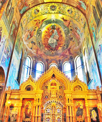 公式名はハリストス復活大聖堂。「血の上の教会」という名前は、アレクサンドル2世が暗殺された場所に建てられた為、名づけられたそうです。教会内部に彩られた絵は全てモザイク画。極小の石を敷き詰めたイコン画はまるで筆で描いたかのように美しく繊細。一見、石とは思えないほどの完成度です。