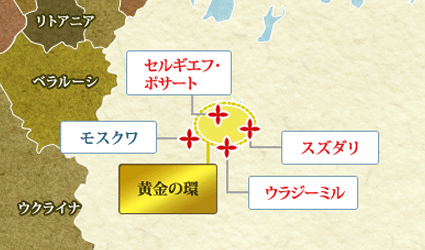 モスクワの北東にある12~13世紀より栄えた古都群。これらをつなぐとほぼ環状形になることから「黄金の環」と呼ばれています。古くは、ザリエーシェとも呼ばれており、これらの古い都市は、ロシア史、ロシア正教会における精神文化、芸術、建築などにおける源流が形成された地域として重要視されます。これらの都市は、11世紀から15世紀末にイワン雷帝が各地を征服し中央集権体制を構築するまで、ロシア諸公国の首都として栄華を誇り、都市自体が野外建築博物館とも言えます。