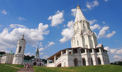14~17世紀、歴代の皇帝が離宮を構え、現在は特別史跡保護区に指定され公園博物館となっているコローメンスコエ。中でも、世界文化遺産にも指定されている1532年建立のヴォズネセーニエ教会(主の昇天教会)は、この美しい史跡公園の緑の中に息を呑むほどの美しさ。