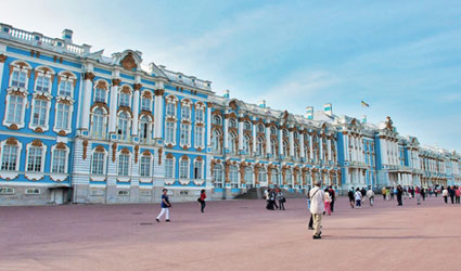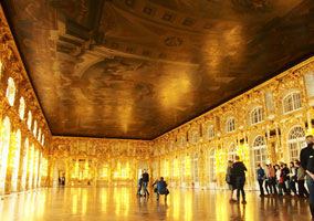 8世紀にピョートル1世が妃エカテリーナ(1世)に石造りのこぢんまりした宮殿を贈ったのが起源となり、1751年から56年にかけてエリザベーター1世の命をうけた建築家ラストレッリによって大改築が行われ、質素な宮殿は華麗なバロック様式の宮殿に変身を遂げました。エカテリーナ宮殿の外壁の全長は740mにおよび、宮殿内部は鏡や金箔を施した見事なレリーフや絵画で装飾されています。