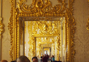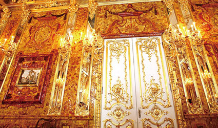 中でも見事なのは琥珀の間。琥珀の装飾パレルは冬宮から移転され、エカテリーナ2世の時代に450kgの琥珀を用いた豪華な部屋は完成しました。第二次世界大戦時ドイツ軍に持ち去られたため、琥珀の間は失われていましたが、1979年から始まった復元作業により、2003年に琥珀の間は完全に復元されました。