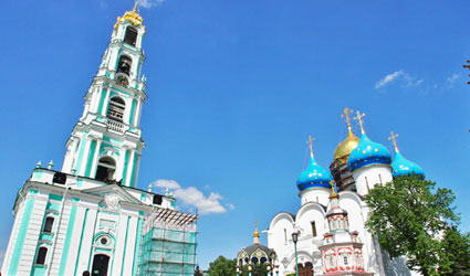 セルギエフ・ポサートはモスクワの北北東70kmに位置し、中部ロシア平原の丘に建つ街です。15世紀の学問と宗教の中心として栄えた街で、地名の由来でもある14世紀の貴族セルギー・ラドネシスキーが、この地に修道の場として小屋と聖堂を建てたのが始まりです。街の中央には、ロシアのバチカンとも呼ばれる世界遺産「トロイツェ・セルギエフ大修道院」があり、16世紀に建造された城壁に囲まれています。大修道院の中には、1422年建立の「トロイツキー聖堂」、1477年建立の「ドゥホフスカヤ聖堂」、1584年にイワンIII世により建立された「ウスペンスキー聖堂」などがあります。